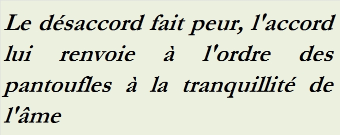 L’accord lui, renvoie à l’ordre des pantoufles, à l’ataraxie, à la tranquillité de l’âme, au sam-suffit des retraités de la bien-pensance.