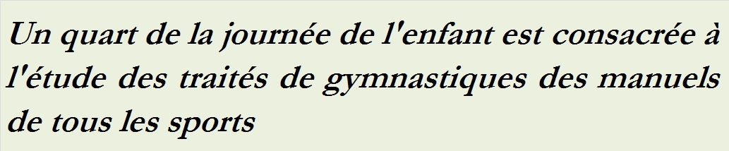 Ainsi l’enfant le plus malingre, au bout de deux ans, sans fatigue et sans perte de temps, sait tout ce qui est à savoir sur la culture physique.