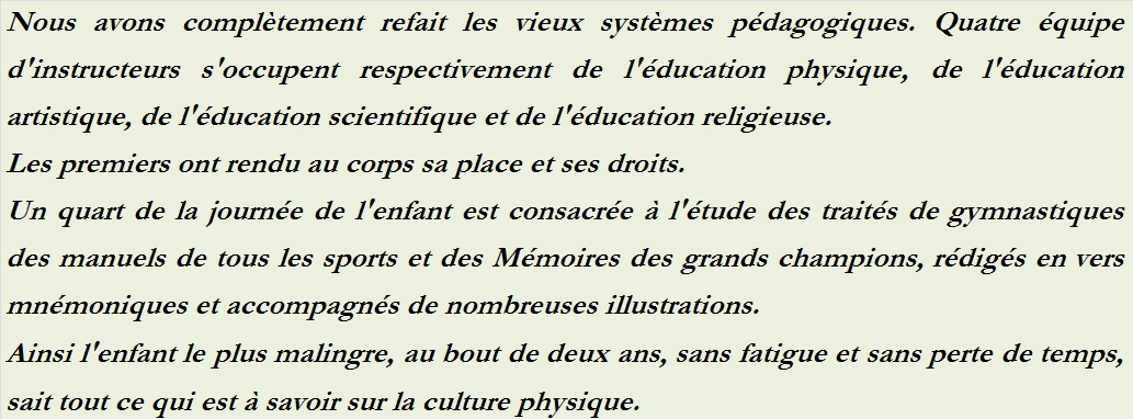 « Nous avons complètement refait les vieux systèmes pédagogiques. Quatre équipes d’instructeurs s’occupent respectivement de l’éducation physique, de l’éducation artistique, de l’éducation scientifique et de l’éducation religieuse.