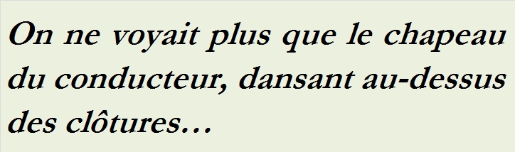« Vacillant comme un homme ivre, le grand garçon, les mains dans ses poches, les épaules rentrées, s’en alla lentement sur le chemin de Sainte-Agathe ; tandis que, dernier vestige de la fête mystérieuse, la vieille berline quittait le gravier de la route et s’éloignait, cahotant en silence, sur l’herbe de la traverse….