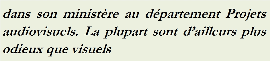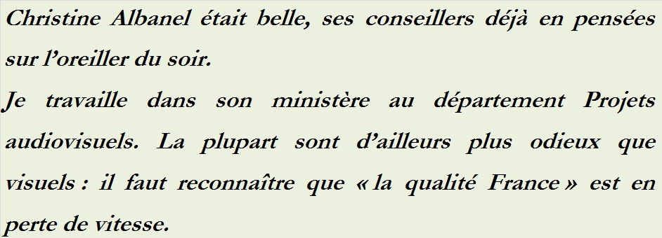 Je travaille dans son ministère au département Projets audiovisuels. La plupart sont d’ailleurs plus odieux que visuels : il faut reconnaître que « la qualité France » est en perte de vitesse.