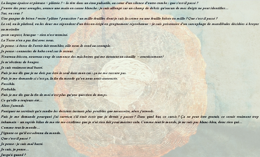 J’ouvre des yeux aveugles, avance une main en canne blanche : je suis allongé sur un champ de débris qu’aucun de mes doigts ne peut identifier…