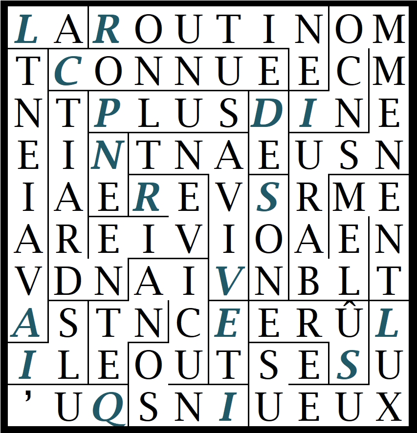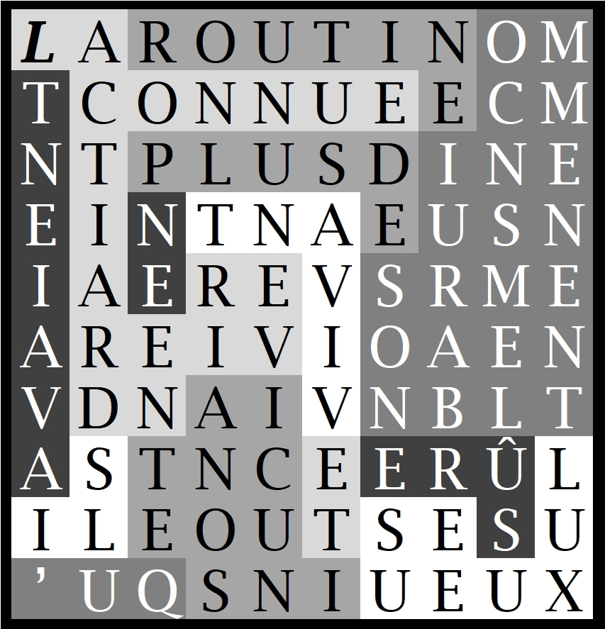 A partir de demain il n’y aura plus qu’une seule proposition de grille (niveau variable) et ce, à l’occasion d’un concours dont le prix sera, pour la ou le gagnant(e), la nouvelle mouture du roman de Claudia Patuzzi « La rive interdite »