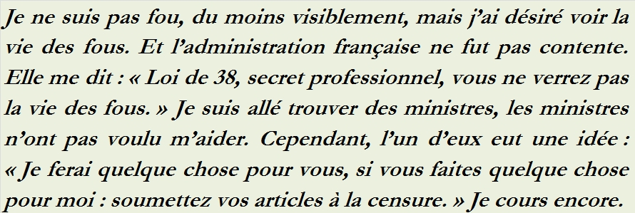 Je ne suis pas fou, du moins visiblement, mais j’ai désiré voir la vie des fous. Et l’administration française ne fut pas contente. Elle me dit : « Loi de 38, secret professionnel, vous ne verrez pas la vie des fous. » Je suis allé trouver des ministres, les ministres n’ont pas voulu m’aider. Cependant, l’un d’eux eut une idée : « Je ferai quelque chose pour vous, si vous faites quelque chose pour moi : soumettez vos articles à la censure. » Je cours encore.