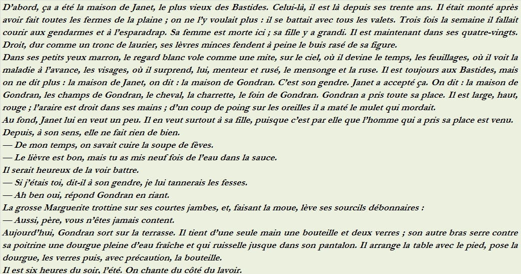 Dans ses petits yeux marron, le regard blanc vole comme une mite, sur le ciel, où il devine le temps, les feuillages, où il voit la maladie à l’avance, les visages, où il surprend, lui, menteur et rusé, le mensonge et la ruse. Il est toujours aux Bastides, mais on ne dit plus : la maison de Janet, on dit : la maison de Gondran. C’est son gendre. Janet a accepté ça. On dit : la maison de Gondran, les champs de Gondran, le cheval, la charrette, le foin de Gondran. Gondran a pris toute sa place. Il est large, haut, rouge ; l’araire est droit dans ses mains ; d’un coup de poing sur les oreilles il a maté le mulet qui mordait.