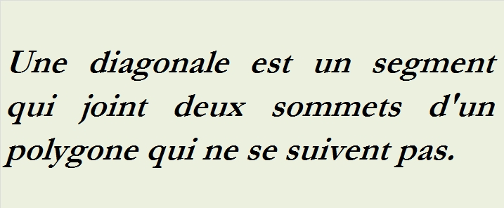 Une diagonale est un segment qui joint deux sommets d’un polygone qui ne se suivent pas.