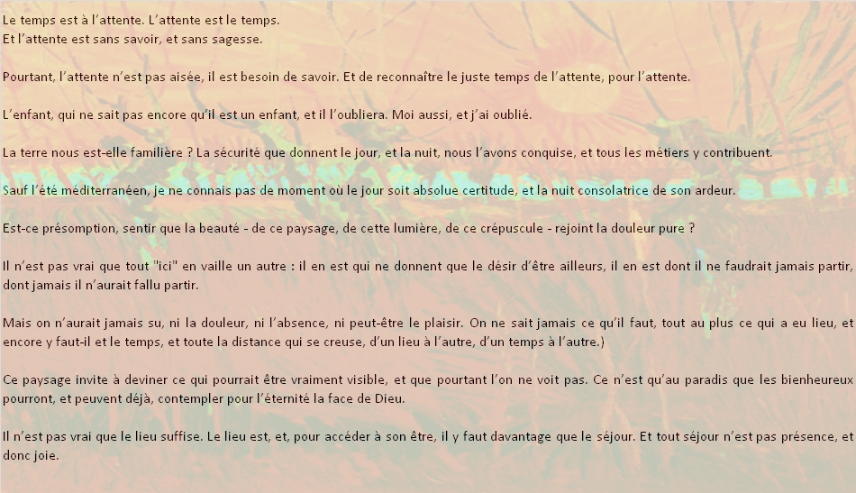 Il n’est pas vrai que le lieu suffise. Le lieu est, et, pour accéder à son être, il y faut davantage que le séjour. Et tout séjour n’est pas présence, et donc joie.