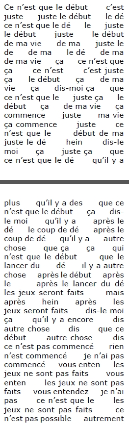 plus qu’il y a des que ce n’est que le début ça dis-le moi qu’il y a après le dé le coup de dé après le coup de dé qu’il y a autre chose que ça ça qui n’est que le début que le lancer du dé il y a autre chose après le début après le après le lancer du dé les jeux seront faits mais après hein après les jeux seront faits dis-le moi ça qu’il y a encore dis autre chose dis que ce début autre chose dis ce n’est pas commencé rien n’est commencé je n’ai pas commencé vous enten les jeux ne sont pas faits vous enten les jeux ne sont pas faits vous entendez je n’ai pas ce n’est que le les jeux ne sont pas faits ce n’est pas possible autrement