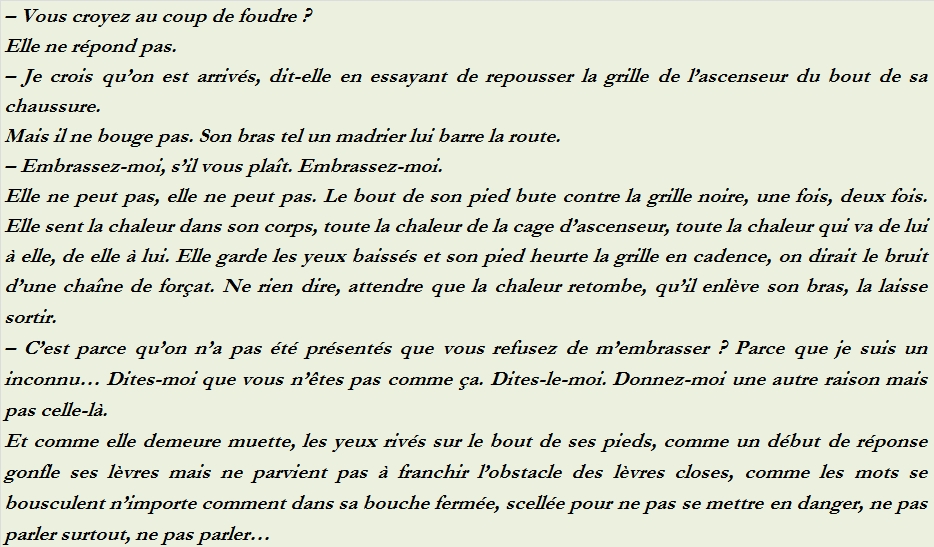 « Elle ne peut pas, elle ne peut pas. Le bout de son pied bute contre la grille noire, une fois, deux fois. Elle sent la chaleur dans son corps, toute la chaleur de la cage d’ascenseur, toute la chaleur qui va de lui à elle, de elle à lui. Elle garde les yeux baissés et son pied heurte la grille en cadence, on dirait le bruit d’une chaîne de forçat. Ne rien dire, attendre que la chaleur retombe, qu’il enlève son bras, la laisse sortir…