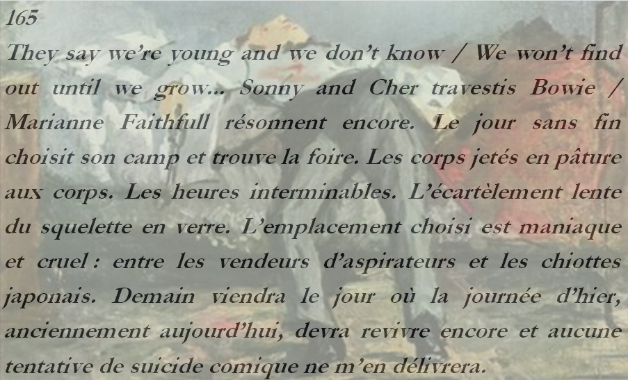 Dressons la liste des dépenses fictives mensuelles en cas d’emménagement futur dans l’appart aux briques rouges. Comparaison papier avec la liste réelle des dépenses actuelles (sur laquelle je fous l’oeil pour la toute première fois). Quant au déménagement lui-même, savoir combien de milliers d’euros il coûterait. Derrière nos dos, la journée, Lalapin a mangé une bonne douzaine de livres, pas entier mais partiellement, parmi lesquels des Agatha Christie, Chloé Delaume ou Sébastien Doubinsky. Certains seront jetés, d’autres pas. Litres de confettis sous les lames du parquet. Regard tombe sur la fiole d’hydroxyethyl et toute réalité humaine environnante s’amenuise.