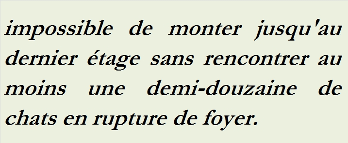 Si nous montons l’escalier, nous le trouvons dans un état de décrépitude fabuleuse : la rampe est brisée en plusieurs endroits et rafistolée à l’aide de grosses ficelles, des planches mal équarries ont été clouées à même les marches fendues ; par temps de pluie, l’eau tombe en petites cascades le long d’elles, et il est impossible de monter jusqu’au dernier étage sans rencontrer au moins une demi-douzaine de chats en rupture de foyer.