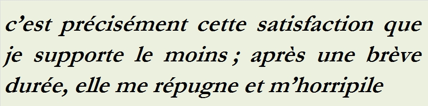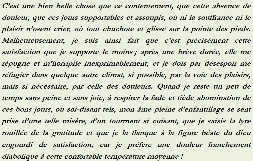 C’est une bien belle chose que ce contentement, que cette absence de douleur, que ces jours supportables et assoupis, où ni la souffrance ni le plaisir n’osent crier, où tout chuchote et glisse sur la pointe des pieds. Malheureusement, je suis ainsi fait que c’est précisément cette satisfaction que je supporte le moins ; après une brève durée, elle me répugne et m’horripile inexprimablement, et je dois par désespoir me réfugier dans quelque autre climat, si possible, par la voie des plaisirs, mais si nécessaire, par celle des douleurs. Quand je reste un peu de temps sans peine et sans joie, à respirer la fade et tiède abomination de ces bons jours, ou soi-disant tels, mon âme pleine d’enfantillage se sent prise d’une telle misère, d’un tourment si cuisant, que je saisis la lyre rouillée de la gratitude et que je la flanque à la figure béate du dieu engourdi de satisfaction, car je préfère une douleur franchement diabolique à cette confortable température moyenne !