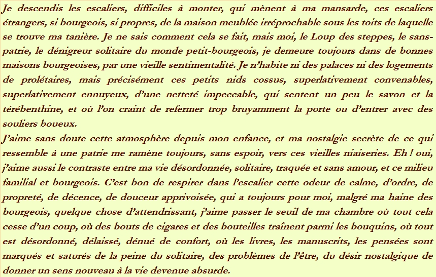 Je descendis les escaliers, difficiles à monter, qui mènent à ma mansarde, ces escaliers étrangers, si bourgeois, si propres, de la maison meublée irréprochable sous les toits de laquelle se trouve ma tanière. Je ne sais comment cela se fait, mais moi, le Loup des steppes, le sans-patrie, le dénigreur solitaire du monde petit-bourgeois, je demeure toujours dans de bonnes maisons bourgeoises, par une vieille sentimentalité. Je n’habite ni des palaces ni des logements de prolétaires, mais précisément ces petits nids cossus, superlativement convenables, superlativement ennuyeux, d’une netteté impeccable, qui sentent un peu le savon et la térébenthine, et où l’on craint de refermer trop bruyamment la porte ou d’entrer avec des souliers boueux.