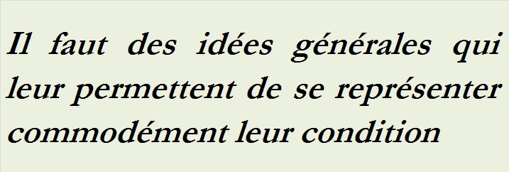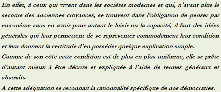 En effet, à ceux qui vivent dans les sociétés modernes et qui, n’ayant plus le secours des anciennes croyances, se trouvent dans l’obligation de penser par eux-même sans en avoir pour autant le loisir ou la capacité, il faut des idées générales qui leur permettent de se représenter commodément leur condition et leur donnent la certitude d’en posséder quelque explication simple.