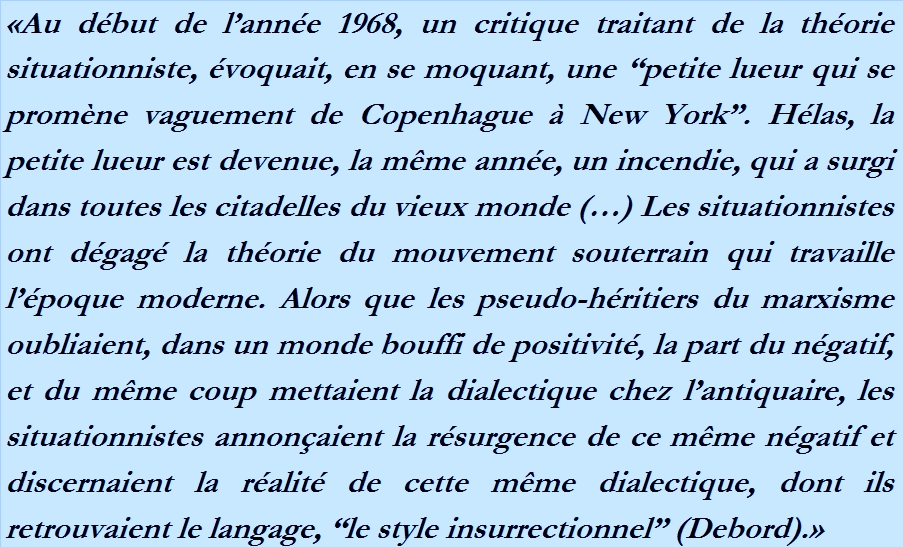 La classe qui accapare le profit économique, n’ayant d’autre but que de conserver la dictature de l’économie indépendante sur la société, a dû jusqu’ici considérer et diriger l’incessante multiplication de la productivité du travail industriel comme s’il s’agissait toujours du mode de production agraire. Elle a poursuivi constamment le maximum de production purement quantitative, à la manière des anciennes sociétés qui, elles, effectivement incapables de jamais reculer les limites de la pénurie réelle, devaient récolter à chaque saison tout ce qui pouvait être récolté. Cette identification au modèle agraire se traduit dans le modèle pseudo-cyclique de la production abondante des marchandises où l’on a sciemment intégré l’usure aux objets produits aussi bien qu’à leurs images spectaculaires, pour maintenir artificiellement le caractère saisonnier de la consommation, qui justifie l’incessante reprise de l’effort productif et maintient la proximité de la pénurie. Mais la réalité cumulative de cette production indifférente à l’utilité ou à la nocivité, en fait indifférente à sa propre puissance qu’elle veut ignorer [«La victoire de l’économie autonome doit être en même temps sa perte. Les forces qu’elle a déchaînées suppriment la nécessité économique qui a été la base immuable des sociétés anciennes. (…) Mais l’économie autonome se sépare à jamais du besoin profond dans la mesure même où elle sort de l’inconscient social qui dépendait d’elle sans le savoir. (…) Au moment où la société découvre qu’elle dépend de l’économie, l’économie, en fait, dépend d’elle. Cette puissance souterraine, qui a grandi jusqu’à paraître souverainement, a aussi perdu sa puissance.» — La Société du spectacle.], ne s’est pas laissé oublier et revient sous la forme la pollution. La pollution est donc un malheur de la pensée bourgeoise ; que la bureaucratie totalitaire ne peut qu’imiter pauvrement. C’est le stade suprême de l’idéologie matérialisée, l’abondance effectivement empoisonnée de la marchandise, et les retombées misérables de la splendeur illusoire de la société spectaculaire.