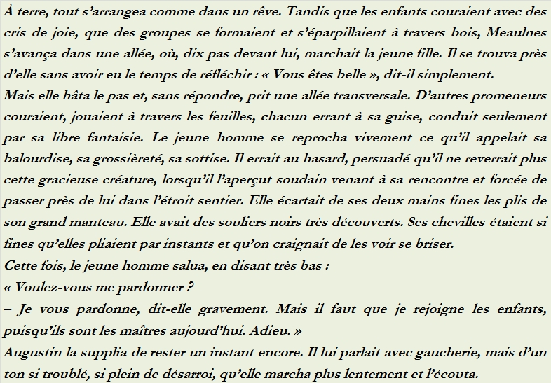 À terre, tout s’arrangea comme dans un rêve. Tandis que les enfants couraient avec des cris de joie, que des groupes se formaient et s’éparpillaient à travers bois, Meaulnes s’avança dans une allée, où, dix pas devant lui, marchait la jeune fille. Il se trouva près d’elle sans avoir eu le temps de réfléchir : « Vous êtes belle », dit-il simplement.