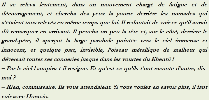 « Il se releva lentement, dans un mouvement chargé de fatigue et de découragement, et chercha des yeux la yourte derrière les nomades qui s’étaient tous relevés en même temps que lui. Il redoutait de voir ce qu’il aurait dû remarquer en arrivant. Il pencha un peu la tête et, sur le côté, derrière le grand-père, il aperçut la large parabole pointée vers le ciel immense et innocent, et quelque part, …