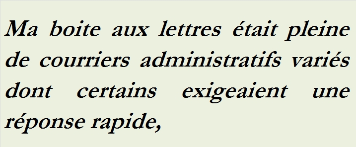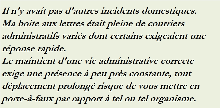 …Le maintient d’une vie administrative correcte exige une présence à peu près constante, tout déplacement prolongé risque de vous mettre en porte-à-faux par rapport à tel ou tel organisme. »