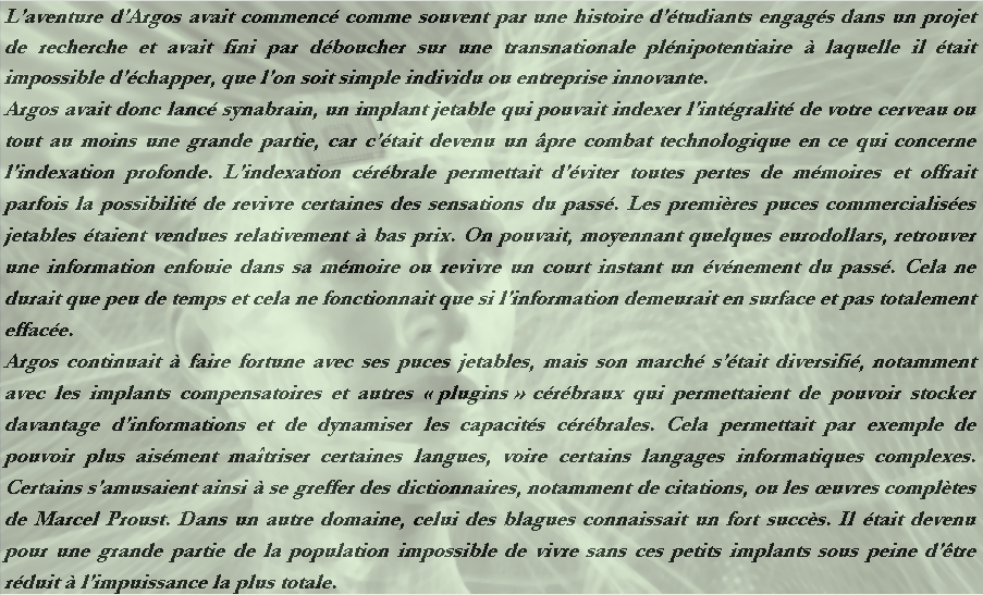 Argos continuait à faire fortune avec ses puces jetables, mais son marché s’était diversifié, notamment avec les implants compensatoires et autres « plugins » cérébraux qui permettaient de pouvoir stocker davantage d’informations et de dynamiser les capacités cérébrales. Cela permettait par exemple de pouvoir plus aisément maîtriser certaines langues, voire certains langages informatiques complexes. Certains s’amusaient ainsi à se greffer des dictionnaires, notamment de citations, ou les œuvres complètes de Marcel Proust. Dans un autre domaine, celui des blagues connaissait un fort succès. Il était devenu pour une grande partie de la population impossible de vivre sans ces petits implants sous peine d’être réduit à l’impuissance la plus totale.
