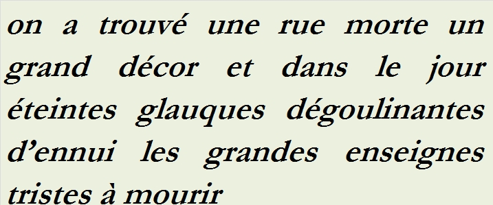 on a trouvé une rue morte un grand décor et dans le jour éteintes glauques dégoulinantes d’ennui les grandes enseignes tristes à mourir