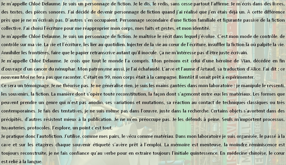 Je m’appelle Chloé Delaume. Je crois que tout le monde l’a compris. Mon prénom est celui d’une héroïne de Vian, décédée en fin d’ouvrage d’un cancer du nénuphar. Mon patronyme aussi, je l’ai échafaudé. L’arve et l’aume d’Artaud, sa traduction d’Alice. J’ai dit : ce nouveau Moi ne fera pas que raconter. C’était en 99, mon corps était à la campagne. Bientôt il serait prêt à expérimenter.