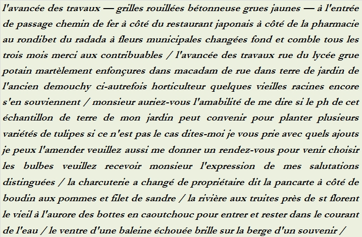 l’avancée des travaux — grilles rouillées bétonneuse grues jaunes — à l’entrée de passage chemin de fer à côté du restaurant japonais à côté de la pharmacie au rondibet du radada à fleurs municipales changées fond et comble tous les trois mois merci aux contribuables / l’avancée des travaux rue du lycée grue potain martèlement enfonçures dans macadam de rue dans terre de jardin de l’ancien demouchy ci-autrefois horticulteur quelques vieilles racines encore s’en souviennent / monsieur auriez-vous l’amabilité de me dire si le ph de cet échantillon de terre de mon jardin peut convenir pour planter plusieurs variétés de tulipes si ce n’est pas le cas dites-moi je vous prie avec quels ajouts je peux l’amender veuillez aussi me donner un rendez-vous pour venir choisir les bulbes veuillez recevoir monsieur l’expression de mes salutations distinguées / la charcuterie a changé de propriétaire dit la pancarte à côté de boudin aux pommes et filet de sandre / la rivière aux truites près de st florent le vieil à l’aurore des bottes en caoutchouc pour entrer et rester dans le courant de l’eau / le ventre d’une baleine échouée brille sur la berge d’un souvenir /