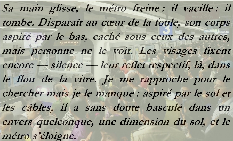 Sa main glisse, le métro freine : il vacille : il tombe. Disparaît au cœur de la foule, son corps aspiré par le bas, caché sous ceux des autres, mais personne ne le voit. Les visages fixent encore — silence — leur reflet respectif, là, dans le flou de la vitre. Je me rapproche pour le chercher mais je le manque : aspiré par le sol et les câbles, il a sans doute basculé dans un envers quelconque, une dimension du sol, et le métro s’éloigne.