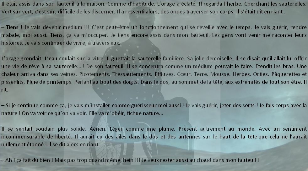 L’orage grondait. L’eau coulait sur la vitre. Il guettait la sauterelle familière. Sa jolie demoiselle. Il se disait qu’il allait lui offrir une vie de rêve à sa sauterelle… ! De son fauteuil. Il se concentra comme un médium pouvait le faire. Etendit les bras. Une chaleur arriva dans ses veines. Picotements. Tressautements. Effluves. Cœur. Terre. Mousse. Herbes. Orties. Pâquerettes et pissenlits. Pluie de printemps. Perlant au bout des doigts. Dans le dos, au sommet de la tête, aux extrémités de tout son être. Il rit.