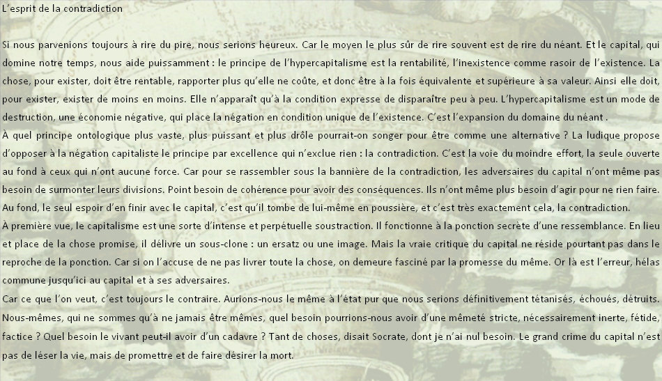 À quel principe ontologique plus vaste, plus puissant et plus drôle pourrait-on songer pour être comme une alternative ? La ludique propose d’opposer à la négation capitaliste le principe par excellence qui n’exclue rien : la contradiction. C’est la voie du moindre effort, la seule ouverte au fond à ceux qui n’ont aucune force. Car pour se rassembler sous la bannière de la contradiction, les adversaires du capital n’ont même pas besoin de surmonter leurs divisions. Point besoin de cohérence pour avoir des conséquences. Ils n’ont même plus besoin d’agir pour ne rien faire. Au fond, le seul espoir d’en finir avec le capital, c’est qu’il tombe de lui-même en poussière, et c’est très exactement cela, la contradiction.
