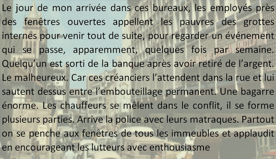 « Peut-être je ne te reverrai plus. En tout cas, écoute-moi bien. Je vais revisser l’écrou du tuyau, et puis je frapperai sur le tuyau. Alors tu compteras lentement jusqu’à mille. Lentement, tu as bien compris. Ne t’occupe de rien d’autre. A mille, tu sors de ta chambre et tu descends jusqu’au premier étage. »…