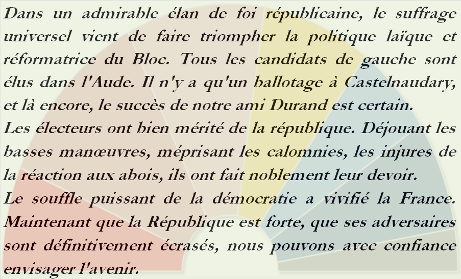 Dans un admirable élan de foi républicaine, le suffrage universel vient de faire triompher la politique laïque et réformatrice du Bloc. Tous les candidats de gauche sont élus dans l’Aude. Il n’y a qu’un ballotage à Castelnaudary, et là encore, le succès de notre ami Durand est certain.