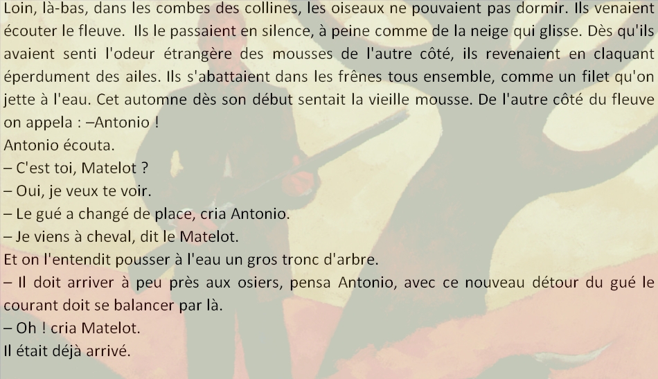 … qui passait parfois au-dessus des arbres comme le cri d’un gros oiseau pour dire la joie d’Antonio sur son fleuve. »