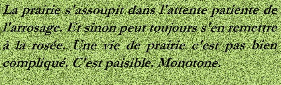 La prairie s’assoupit dans l’attente patiente de l’arrosage. Et sinon peut toujours s’en remettre à la rosée. Une vie de prairie c’est pas bien compliqué. C’est paisible. Monotone.