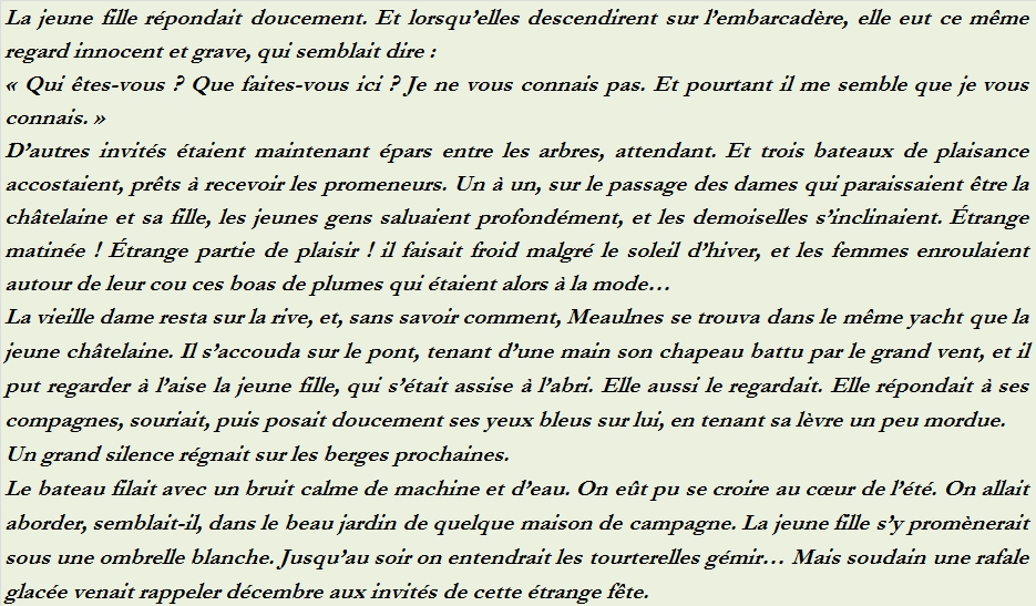 … D’autres invités étaient maintenant épars entre les arbres, attendant. Et trois bateaux de plaisance accostaient, prêts à recevoir les promeneurs. Un à un, sur le passage des dames qui paraissaient être la châtelaine et sa fille, les jeunes gens saluaient profondément, et les demoiselles s’inclinaient. »
