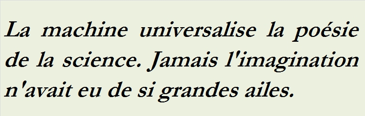 L’enfant, l’homme de peine, le plus inculte des manœuvres, le primitif peuvent explorer aujourd’hui les gouffres creusés par le télescope et le microscope et qui ne sont que l’antichambre des espaces infinis où la gravitation entraîne l’âme dans le vertige silencieux d’une mystique nouvelle, capable de trouver l’accord de l’humain le plus sensible avec le déroulement mécanique de l’univers le plus indifférent. La machine universalise la poésie de la science. Jamais l’imagination n’avait eu de si grandes ailes.