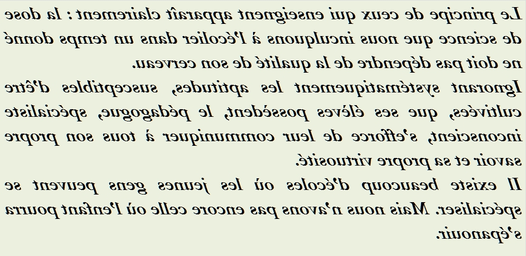 Le principe de ceux qui enseignent apparaît clairement : la dose de science que nous inculquons à l’écolier dans un temps donné ne doit pas dépendre de la qualité de son cerveau.