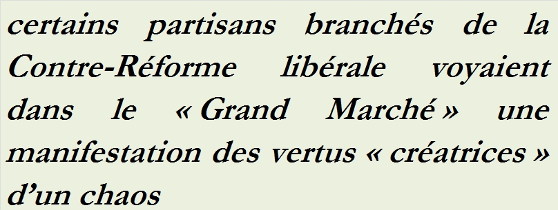 L’imposture pseudo-libertaire du « chaos » et de « l’auto-organisation » méritait une attention particulière. Le lecteur surpris de découvrir une analyse du chaos après une description d’une soirée au Palace ne devra pas oublier que certains partisans branchés de la Contre-Réforme libérale voyaient dans le « Grand Marché » une manifestation des vertus « créatrices » d’un chaos et souhaitaient donc liquider au plus vite l’État-providence, cette « structure dissipative » encombrante héritée de la deuxième vague industrielle, pour faire place nette à la troisième vague postindustrielle, légère, urbaine et nomadiste.