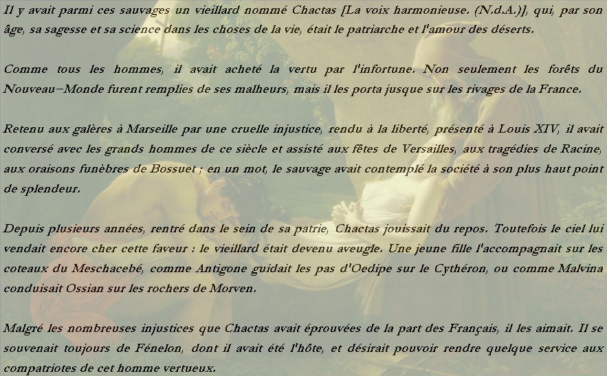 Depuis plusieurs années, rentré dans le sein de sa patrie, Chactas jouissait du repos. Toutefois le ciel lui vendait encore cher cette faveur : le vieillard était devenu aveugle. Une jeune fille l’accompagnait sur les coteaux du Meschacebé, comme Antigone guidait les pas d’Oedipe sur le Cythéron, ou comme Malvina conduisait Ossian sur les rochers de Morven.