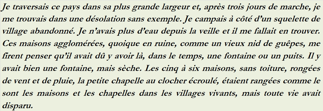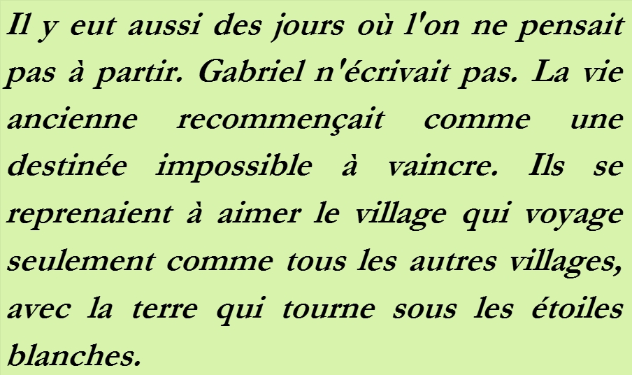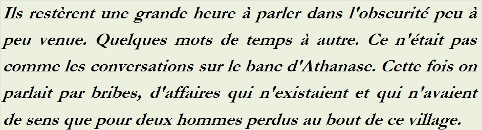 « Ils restèrent une grande heure à parler dans l’obscurité peu à peu venue. Quelques mots de temps à autre. Ce n’était pas comme les conversations sur le banc d’Athanase …