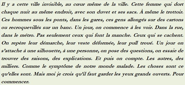 | Une question de dépossession. Derrière la vitre, la ville se déroule dehors, sans moi. La ville ne résonne pas et ne raconte rien. La ville plate, sa profondeur défaite, un décor peint sur une bâche tendue entre deux rouleaux, quel machiniste a oublié de l’actionner. |